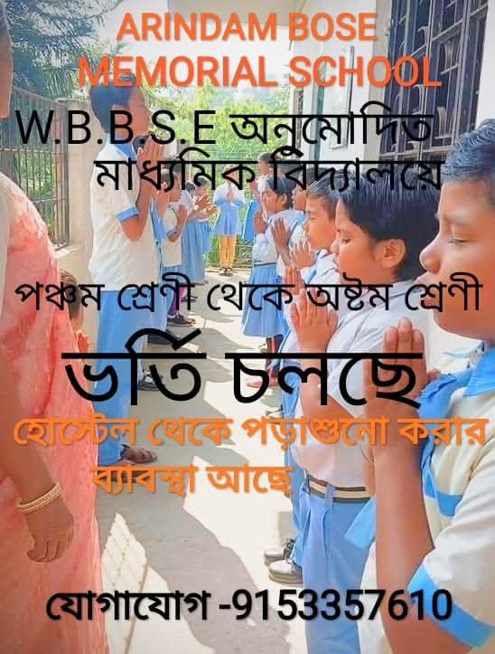 Arindam Bose Memorial School is a West Bengal Board-approved institution, affiliated with W.B.B.P.E. and W.B.B.S.E., offering quality education from Nursery to Class 10. Committed to fostering academic excellence and holistic development, the school provides a nurturing environment for young minds to thrive. With minimal fees, we ensure access to education for all, emphasizing inclusive learning and opportunities. Our dedicated faculty, activity-based curriculum, and focus on moral and intellectual growth prepare students for a bright future, making education affordable and impactful for the community.